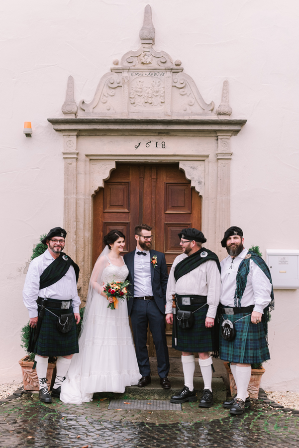 Well, they couldn't have picked a finer scene. Schloß Buchenau was picture perfect with just the right touch of Scottishness to it. Jan's close connections to Scotland (having worked there) meant that there were a few nods to Scotland - their parents had organised a pipe band to play after their ceremony, Jan's suit had a touch of tartan in the material. And although this cannot be organised in quite the same way, there was a slight drizzle in the air, which only added to the atmosphere!
